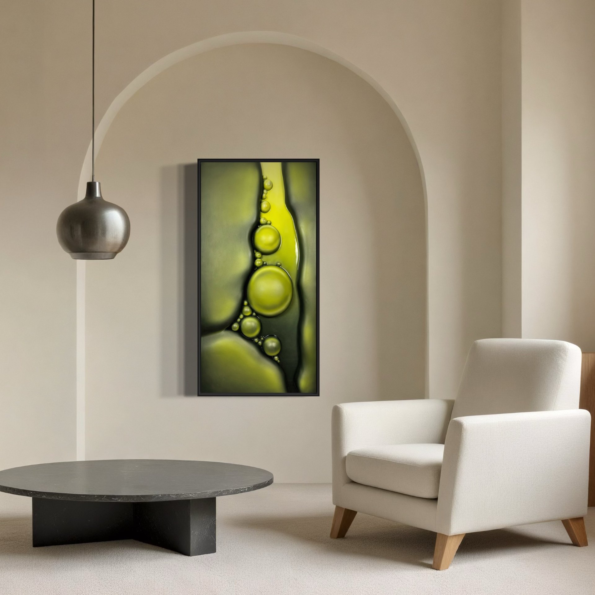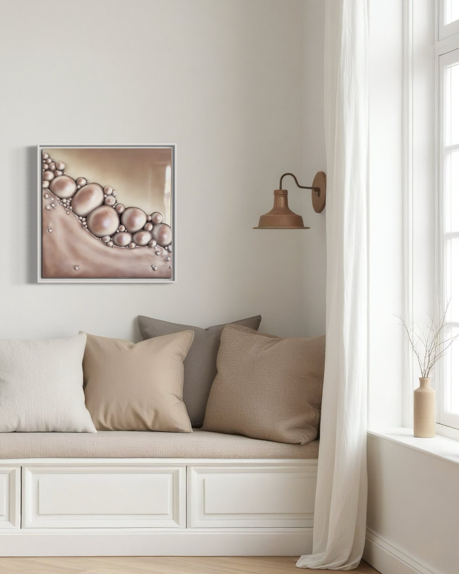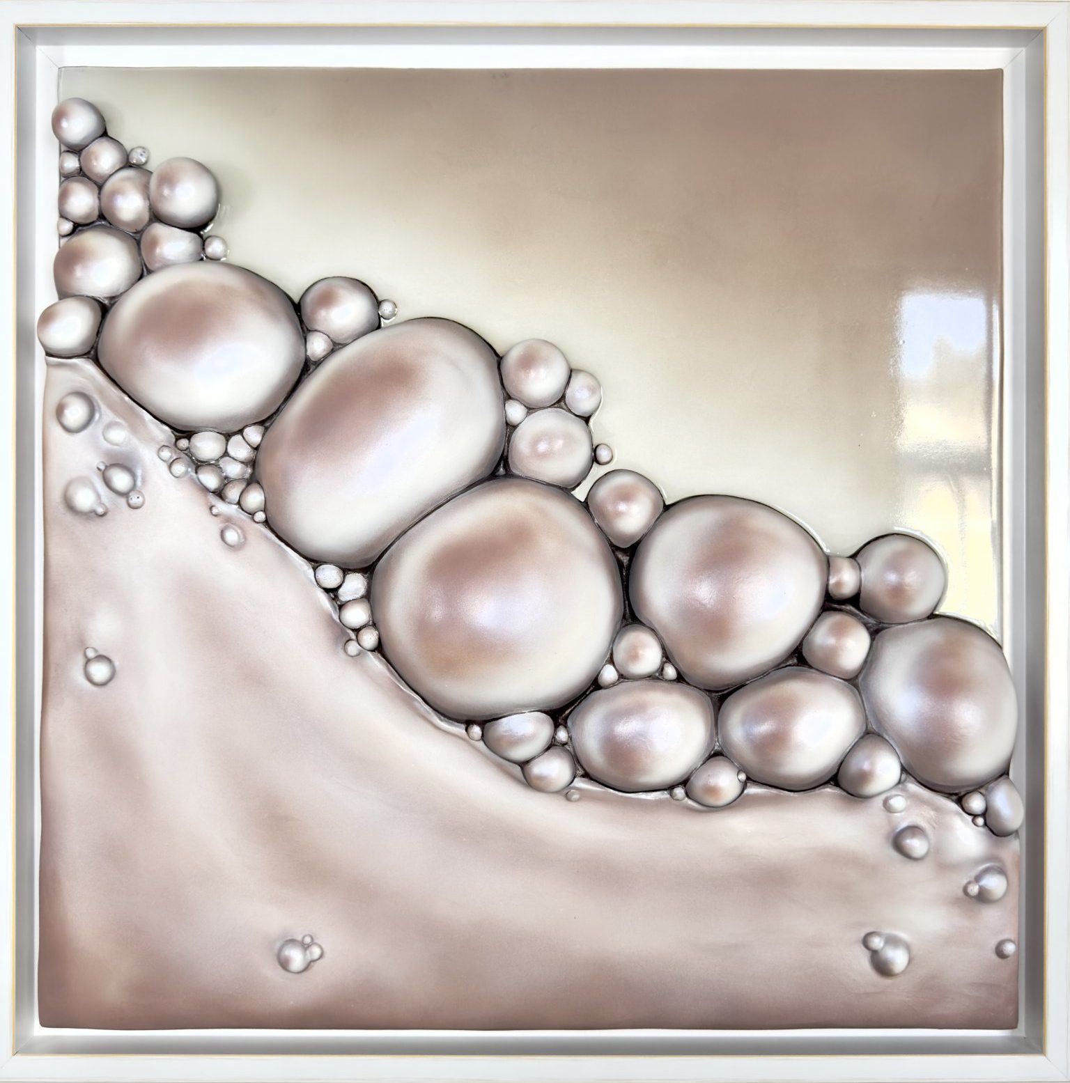 The artwork has a soft, organic feel with pearl-like, fluorescent bubbles flowing in a natural arrangement. It evokes the gentle movement of nature, like water shaping stones over time.
