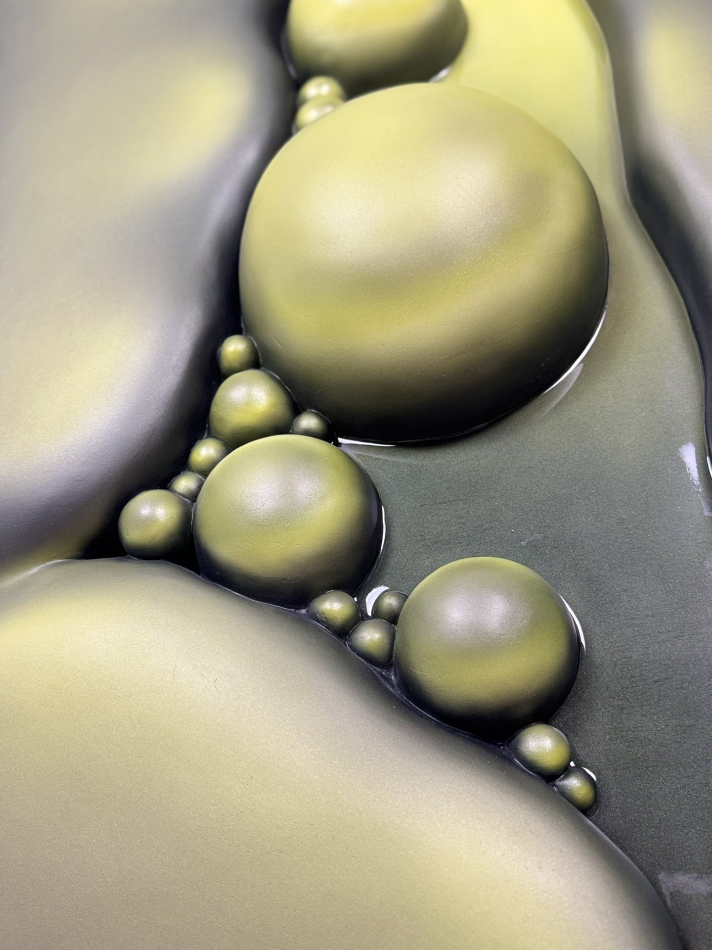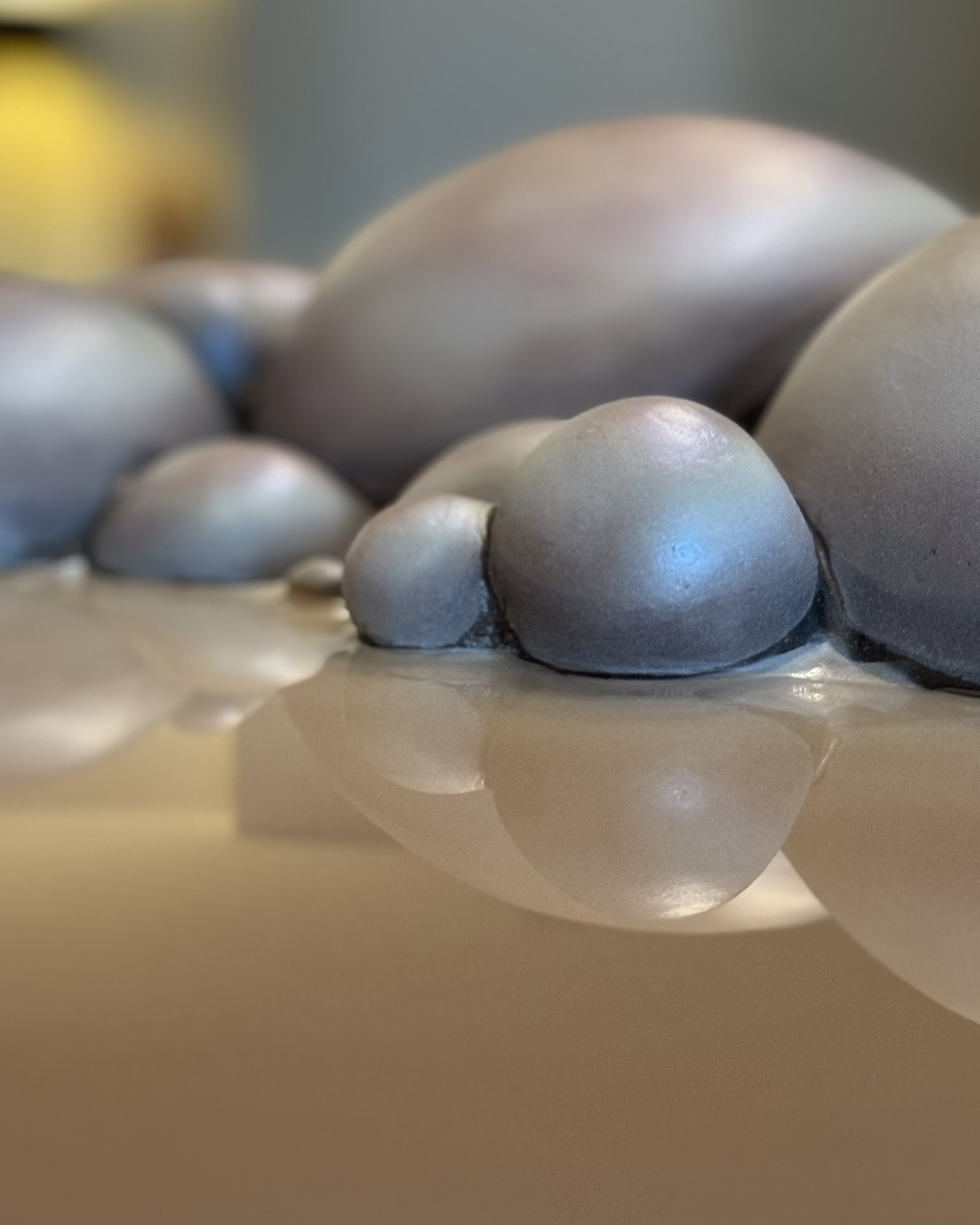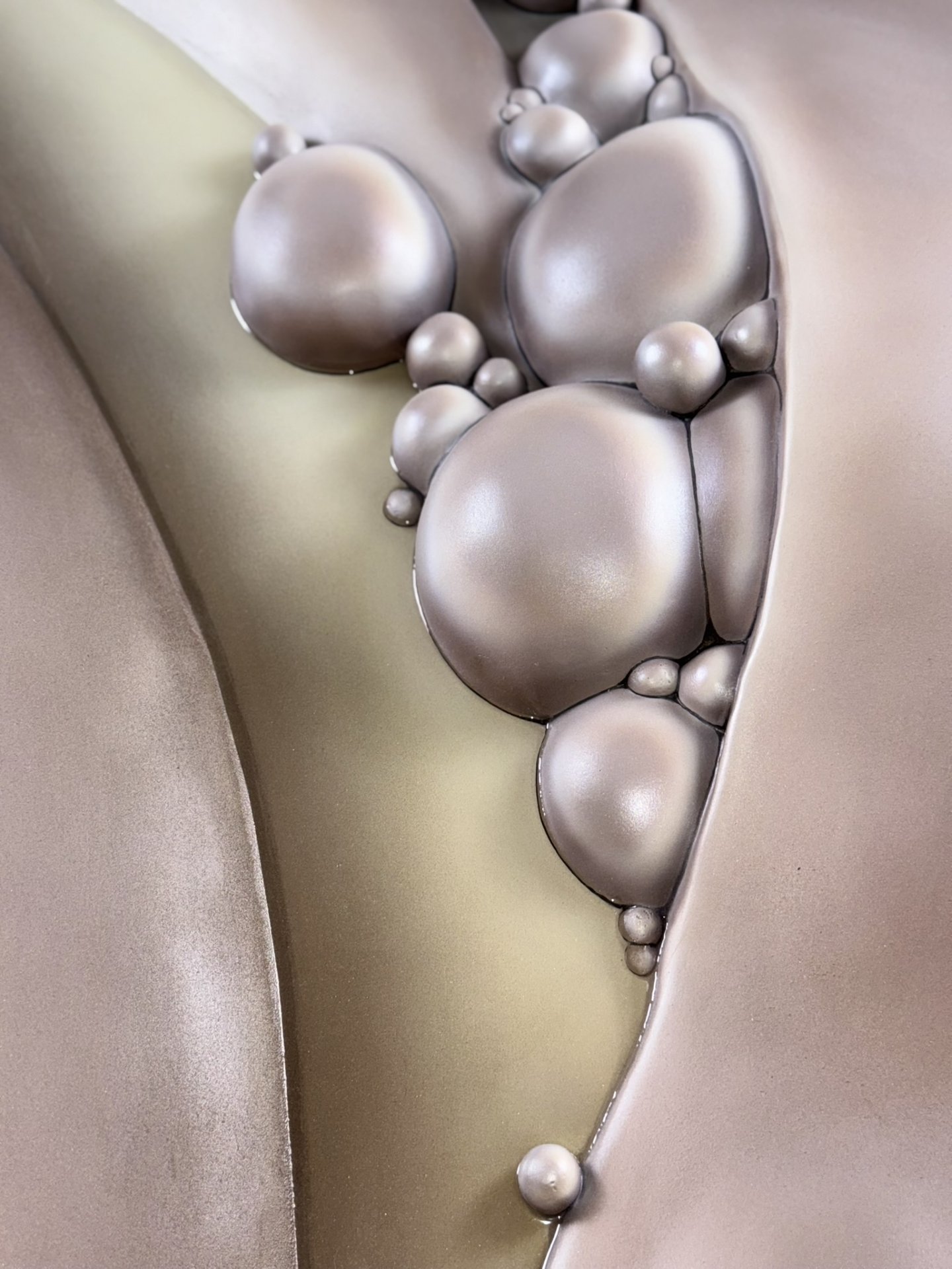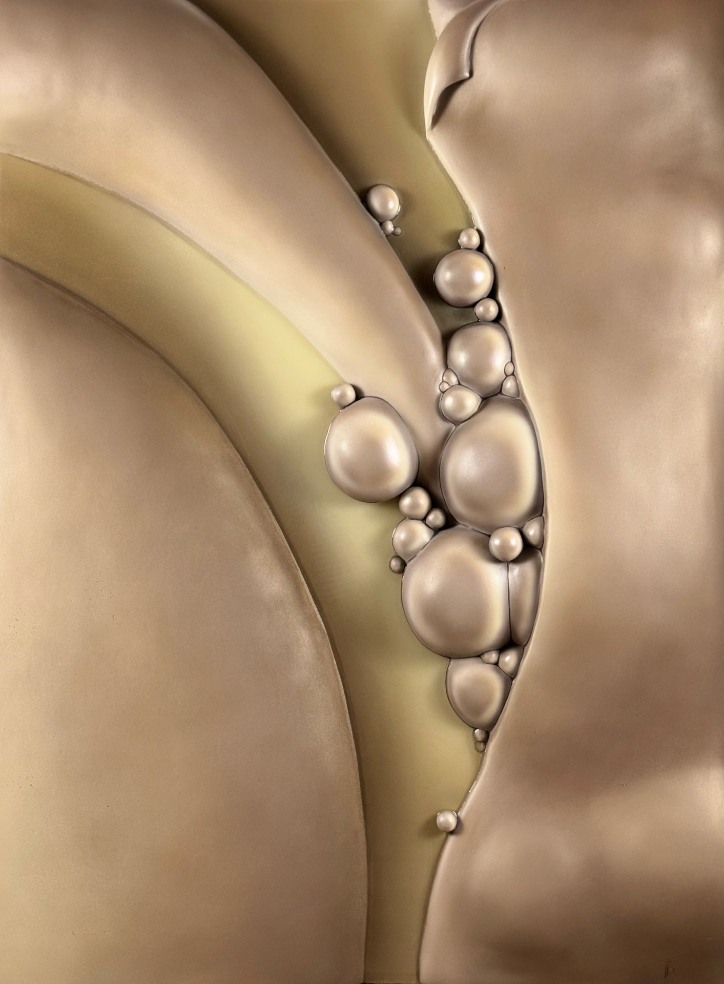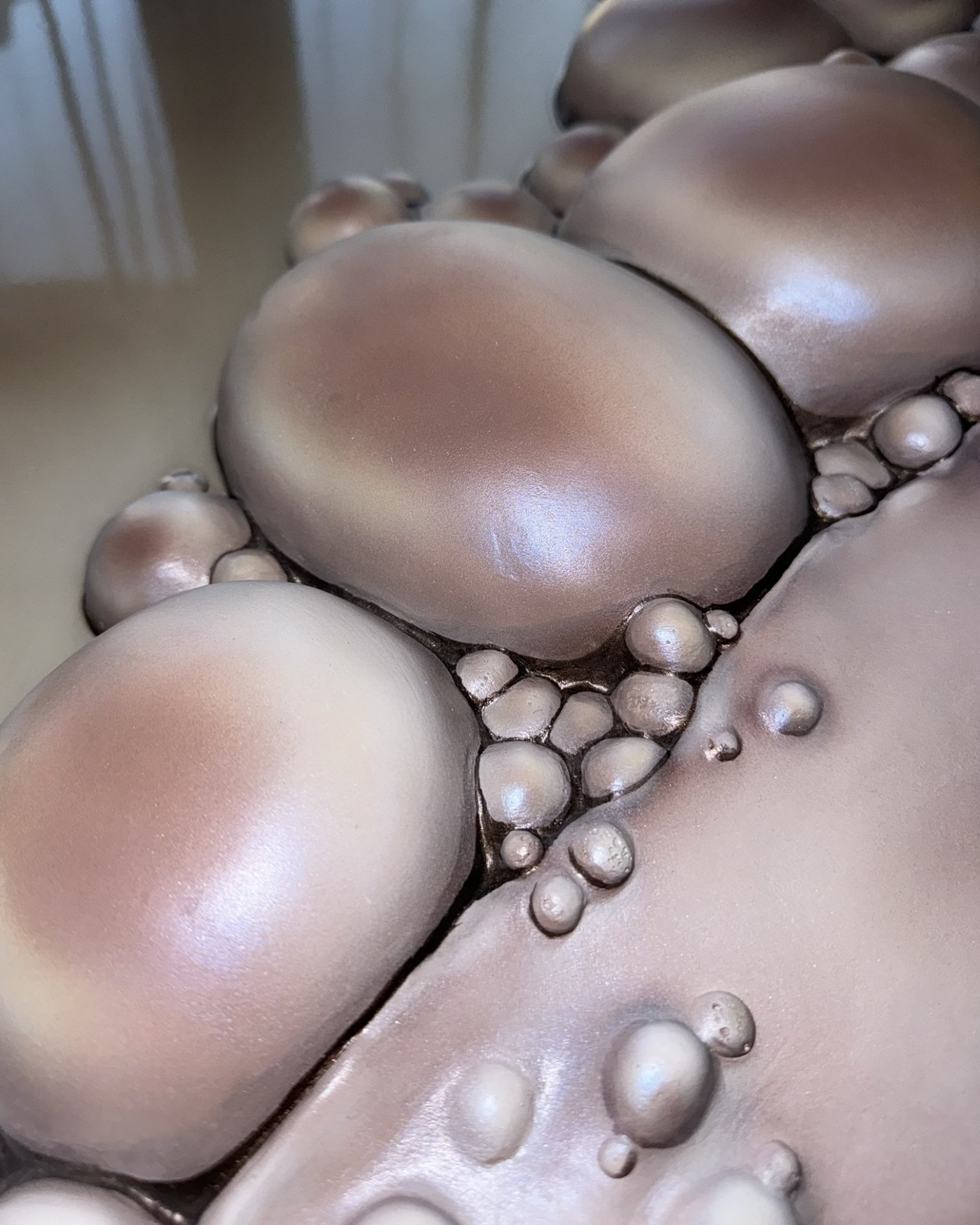 The artwork has an organic, fluid quality with soft, rounded forms that seem to emerge and merge together. It’s reflecting both the smooth sculptural flow and the clustered, bubble-like formations that evoke natural processes of change and growth.