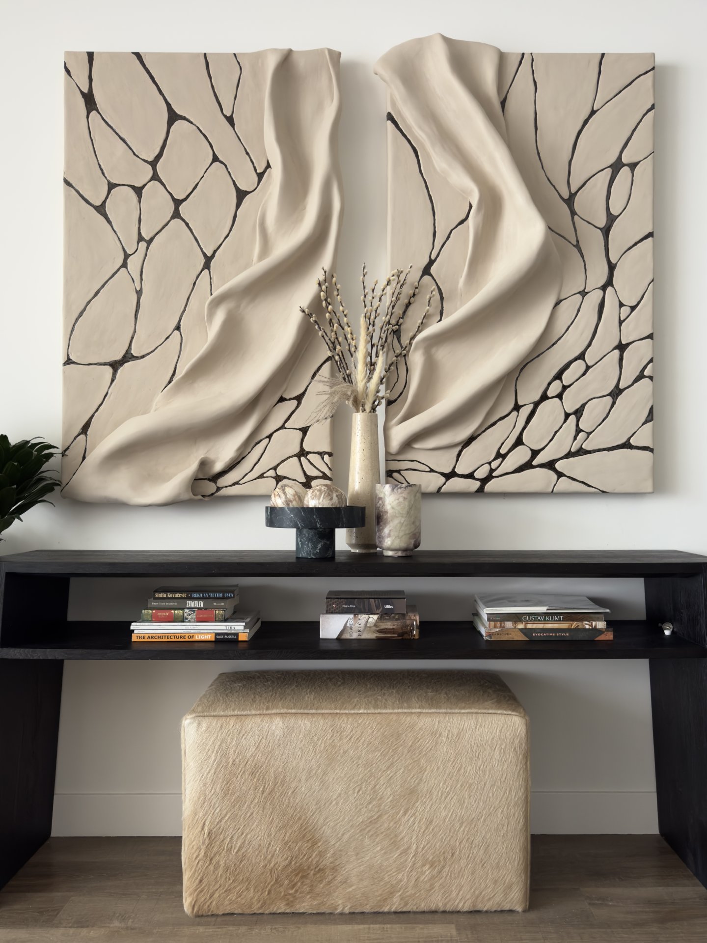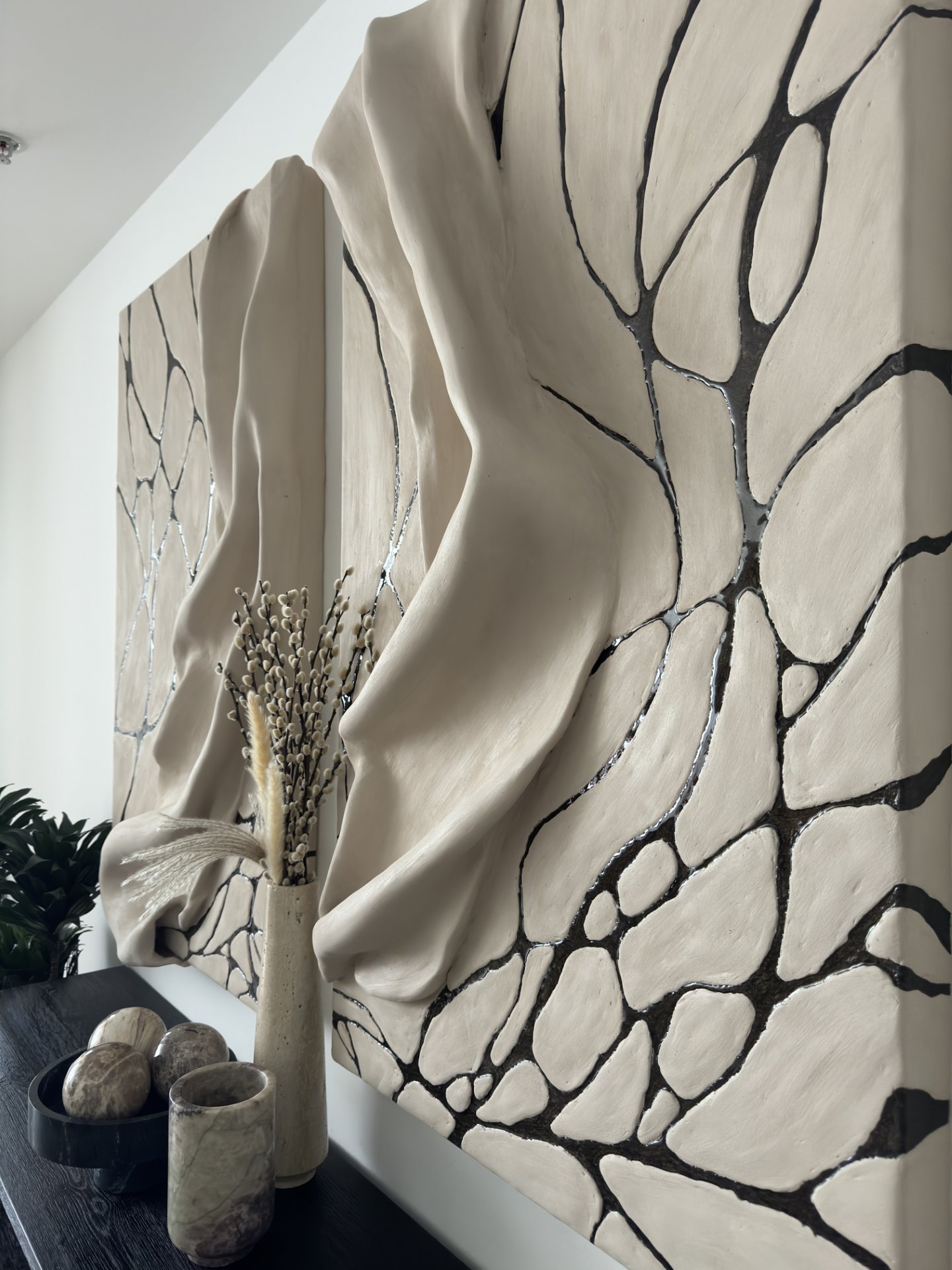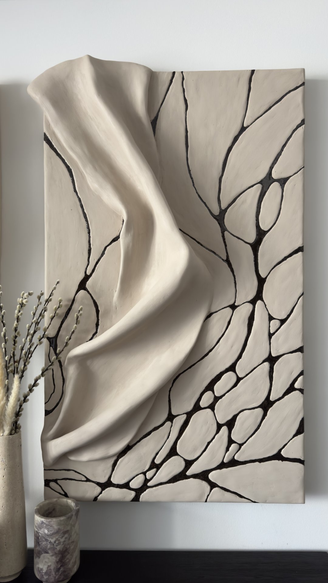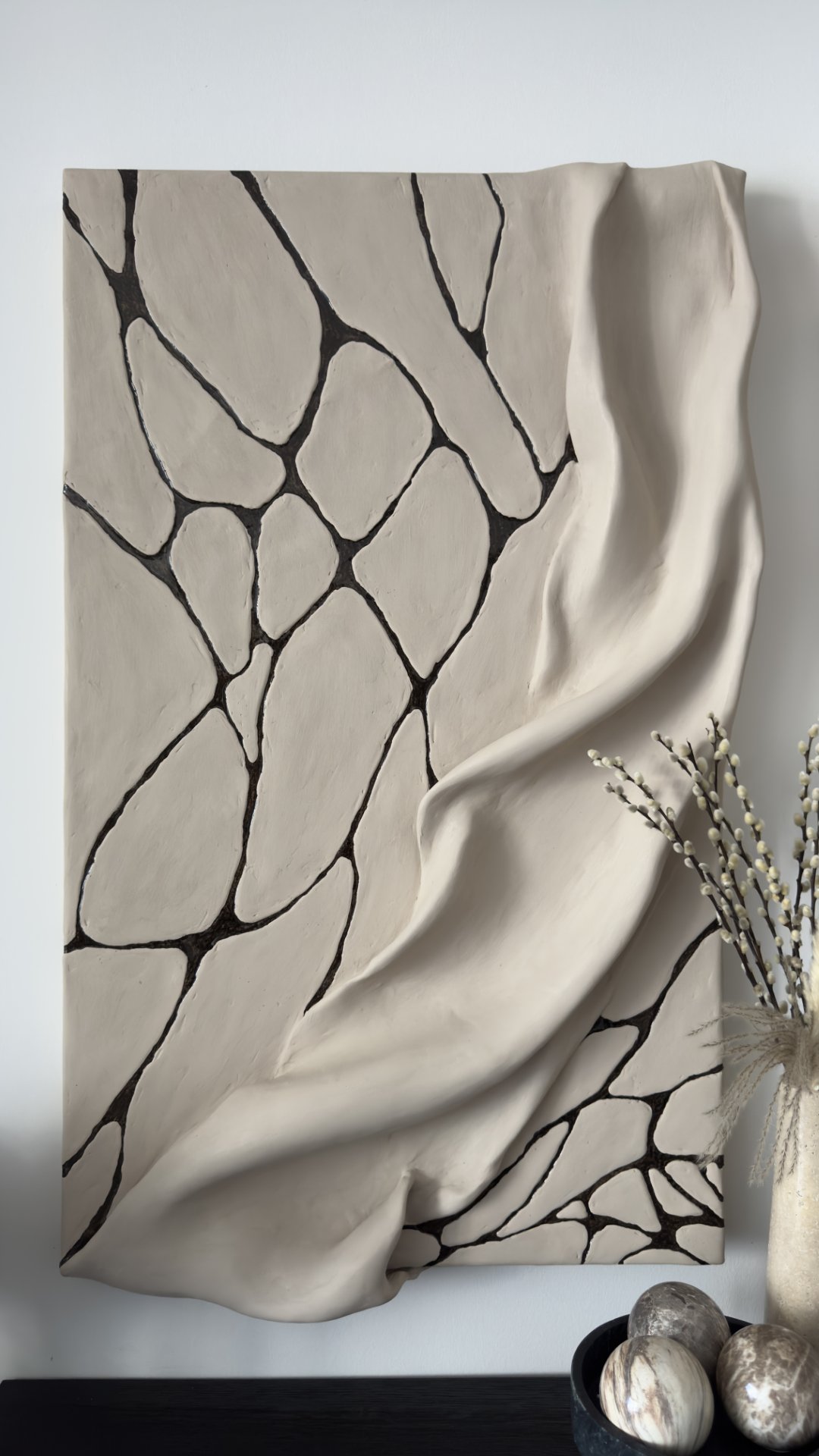 The artwork has an organic, flowing texture with a cracked, vein-like pattern, evoking a sense of movement and nature. It captures both the softness of the draped effect and the structured, organic lines.